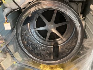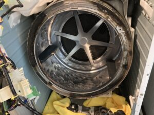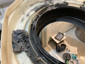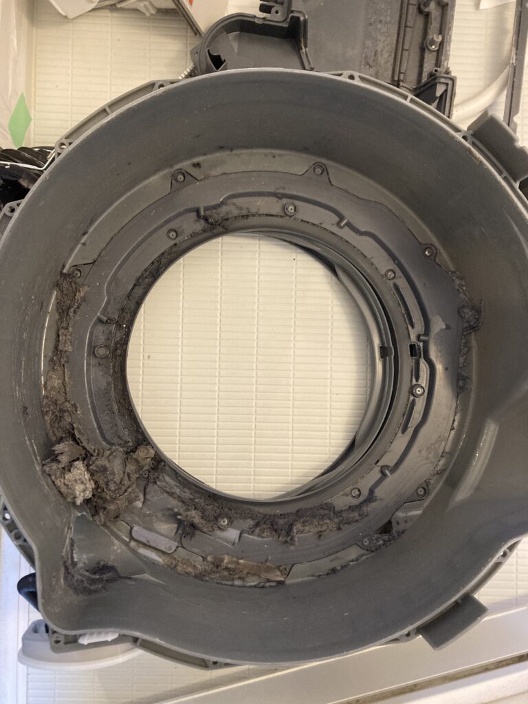 さっそく分解してみると、まず目に飛び込んできたのは洗濯機内部に散らばった大量の埃。本来、埃はフィルターへ運ばれるはずなのに、なぜ……?