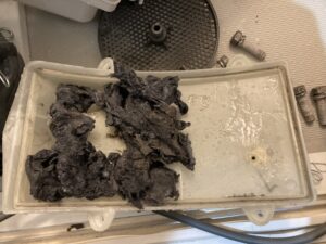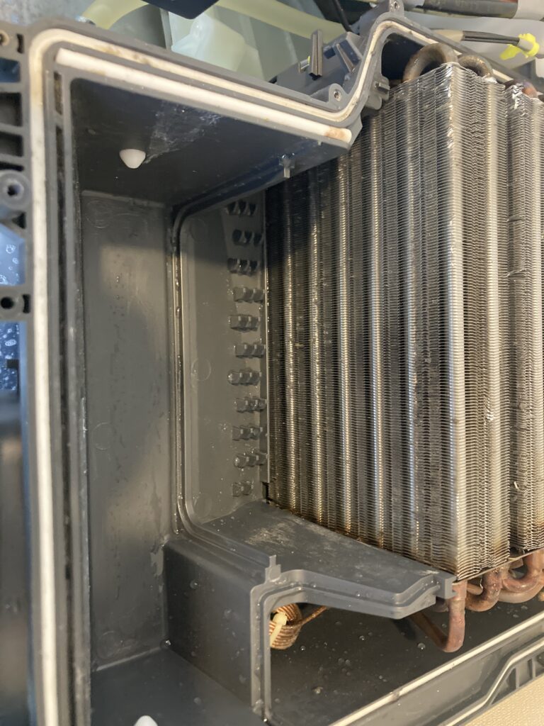 分解を進めると、ヒートポンプの排水経路が埃で詰まっているのを発見。